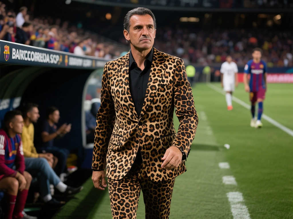 球场时尚风!解放者杯赛场,巴塞罗那SC主帅豹纹西装惊艳亮相